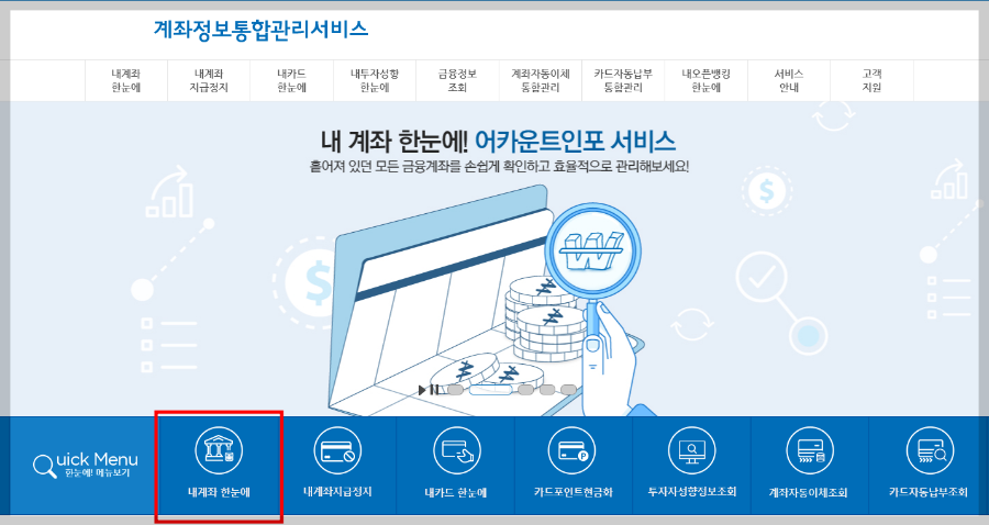 ▶ 계좌정보통합관리서비스 검색 > 내계좌 한눈에 > 개인정보수집 및 이용동의 > 계좌통합조회