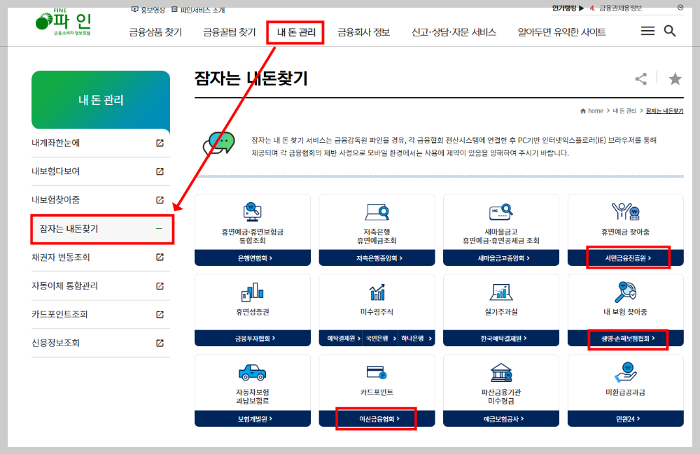 금융감독원 홈페이지 > 파인(www.find.or.kr) > 내돈관리 > 잠자는 내돈찾기 순서로 들어갑니다.