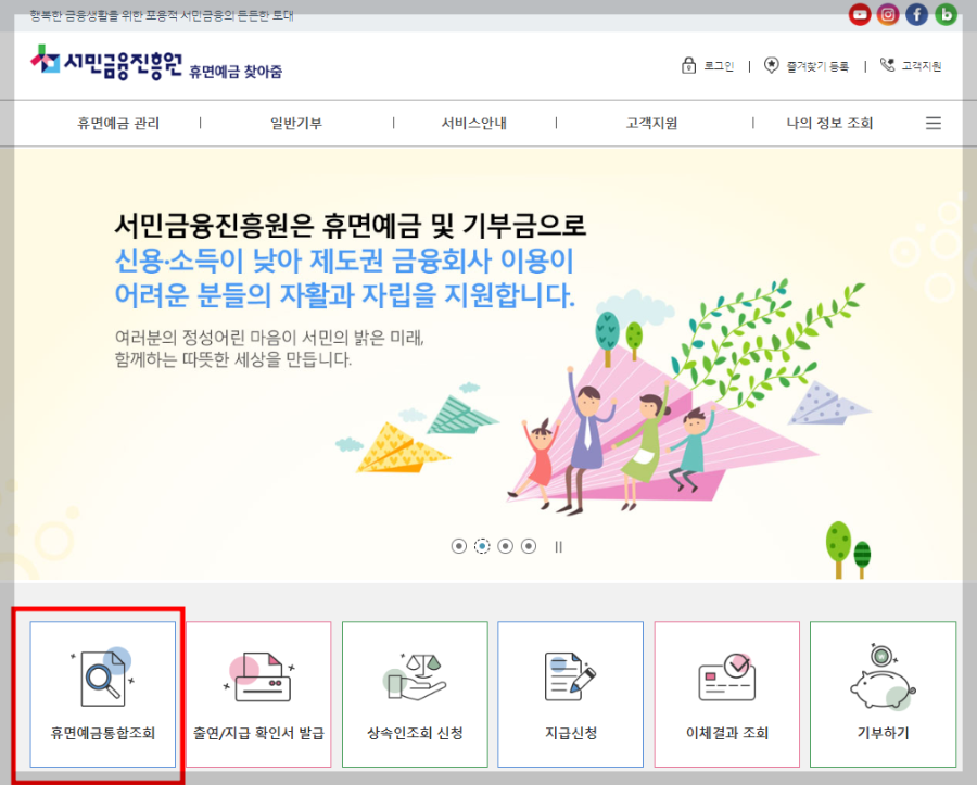 ▶ 휴면예금 : 서민금융진흥원 > 휴면예금 찾아줌